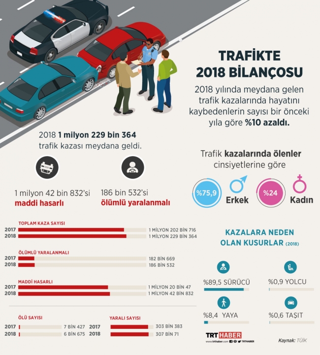 Türkiye İstatistik Kurumu (TÜİK), 2018 yılı karayolu trafik kaza istatistiklerini açıkladı. Buna göre; Türkiye karayolu ağında 2018 yılında;